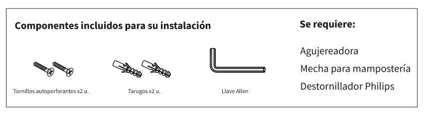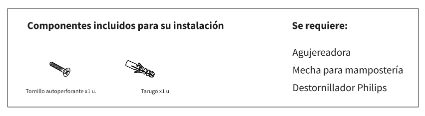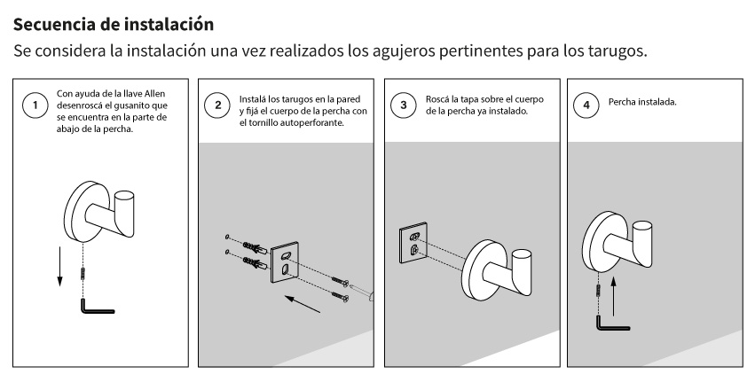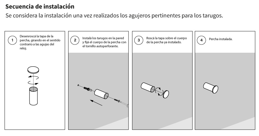 Cada percha incluye su sistema de fijación para ser amurada a la pared, variando sus componentes dependiendo el modelo de percha que se quiera instalar.