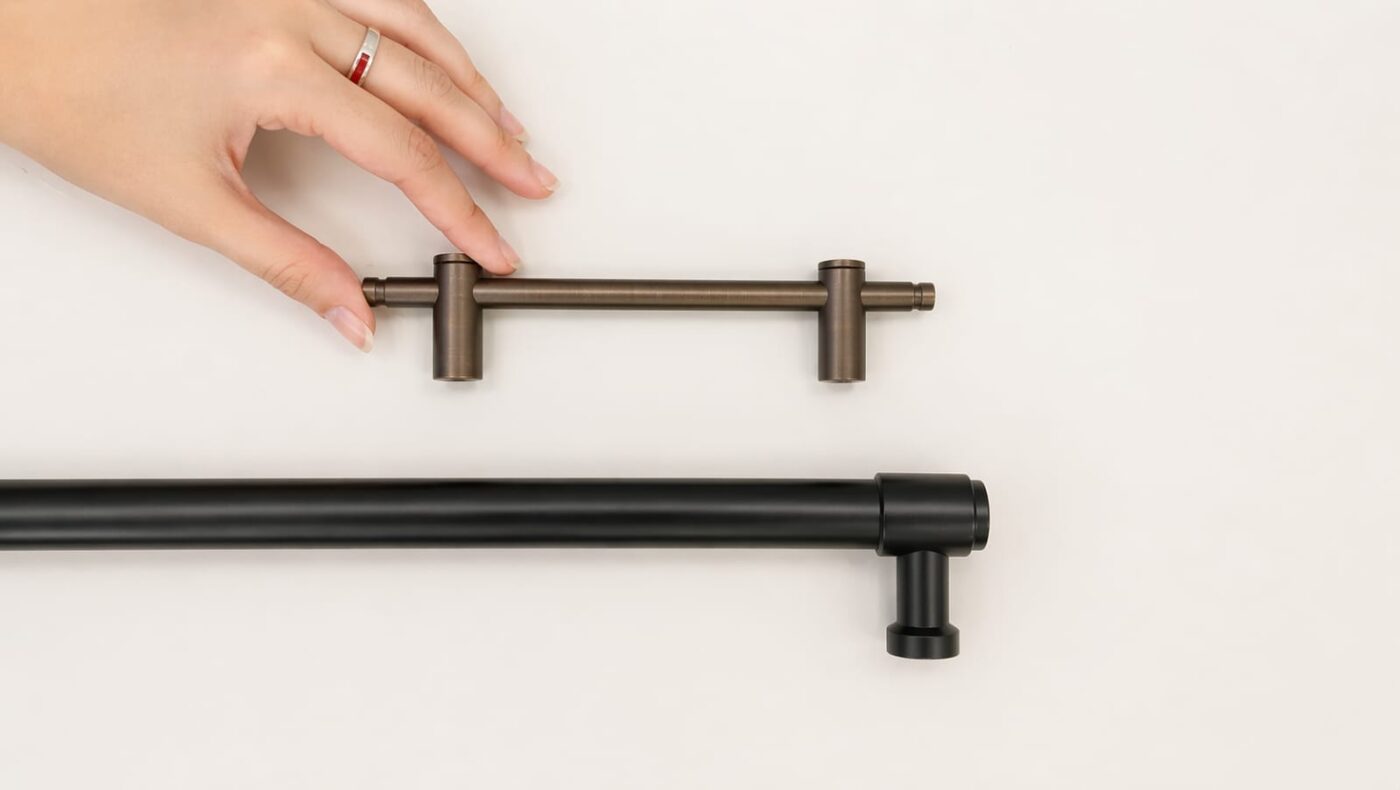 Su escala y ergonomía son comparables a las manijas de una heladera tradicional, lo que garantiza mayor comodidad y facilidad de uso. En la foto se pueden comparar una manija de mueble con una manija para panelables.