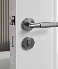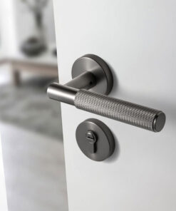 Juego de manija de puerta con cerradura. Está diseñado para puertas interiores y es compatible con una caja de cerradura estándar. Fabricadas en latón sólido con detalles de textura moleteado, lo que le da un aspecto moderno e industrial. Se entrega como un par, incluyendo la placa de llave (escutcheon) haciendo juego.